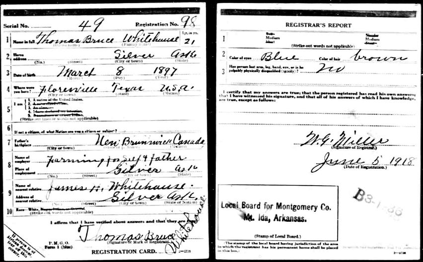 Surname First names DOB Place of birth Registered Abernathy Alfred F. 2 Feb 1891 Oden AR Montgomery AR Abernathy James Willie 14 Aug 1896 Gaston AR Montgomery AR Abernathy Jesse Fo_o 7 May 1890 Mt. Ida AR Gillespie TX Abbott William Allen 29 Aug 1893 born & lives in Liberty AR Montgomery AR Abee Elijah 28 Oct 1889 Inito AR Montgomery AR Abshire James Carrill 14 Mar 1875 Montgomery AR Adamson Elliett Green 7 Dec 1897 lives in Avant AR Montgomery AR Adcock Charley Athar 18 Jun 1884 Montgomery AR Adcock Jasper D. 21 Oct 1877 Montgomery AR Adcox Omer DeWitt 16 Jun 1896 Hickory Station AR Montgomery AR Adams Edmon Morgan 8 Jul 1878 Montgomery AR Adams Henry Elbert 10 Feb 1882 Montgomery AR Adams John Sid 4 Jul 1888 Yell Co. AR Montgomery AR Adams Joseph Green 26 Feb 1880 Montgomery AR Adams William Archie 15 May 1884 lives in Glenwood AR Montgomery AR Alexander Clyde 16 Feb 1886 relative lives RFD Mt. Ida AR Tishomingo MS Bates Guy 3 Feb 1896 Montgomery Co. AR Terry TX Chapman John Quincy 4 Oct 1892 Oden AR Lipscomb TX Mitchell Thomas Green 28 Jan 1888 Mt. Ida AR Stone AR Pate Henry 4 Oct 1877 rel. lives Montgomery Co. AR McCarthy AK Rouse E.C. Apr 1887 Montgomery Co. AR Attala MS Stafford Willis Whitfiled 1 Oct 1887 Black Springs AR Terry TX Tinkle Stanley 4 Nov 1897 works in Albert AR Tate MS Van Steenwyk John Gusbert 4 Mar 1889 Black Springs AR Menard TX