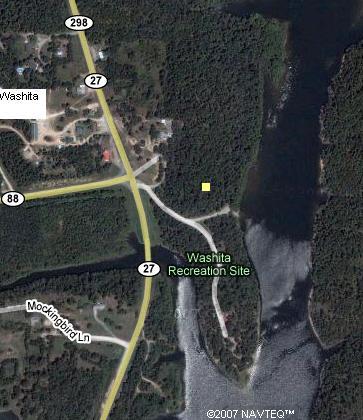 The cemetery is located on a knob covered with pine trees over looking Lake Ouachita, a peaceful spot. Actually easy to find if you know where to look. At the Washita Recreational site intersection of Hwy 27 and 88 if coming from Sims drive across the road, don't take the Mathews Hill road but head towards the recreational site with its picnic tables but park just before the short road heading down towards boat put in. About a two minute walk up hill off the gravel road through a forest of pine trees. Look for a big pine tree and beyond that a fence with the green white tipped standards marking Drew's headstone. About 100 feet to the SE is the lone 3ft high headstone marking the Cothern grave. OW Dec. 2007]
