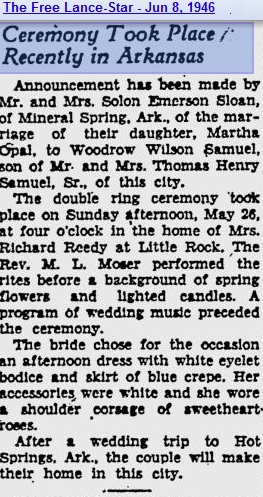 Spring, Ark., of the marriage of their daughter, Martha Opal, to Woodrow Wilson