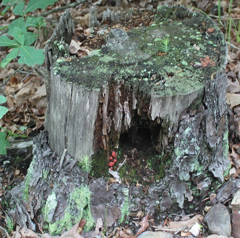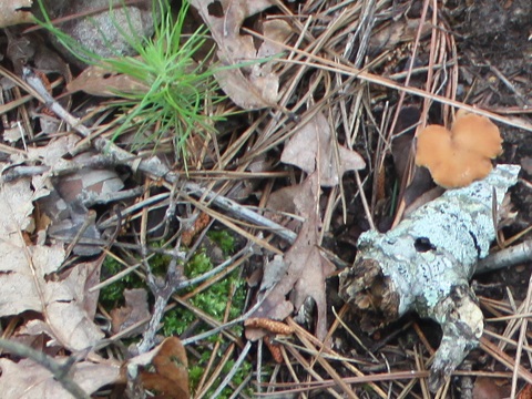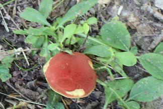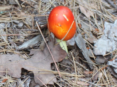 The turtle is a three-toed box turtle Terrapene carolina triunguis. The Ouachita National Forest also has the Eastern box turtle which is similar. On the back legs, the three toed box turtle has three toes versus the four toes on the hind legs of the Eastern Box Turtle. During mid May to mid June many box turtles can been seen on the roads, when it is the mating season. Many get run over. Don't take them home for pets - another contributing factor to their mortality, and they smell when placed in the back seat!. A box turtle average life span is 25-30 years and it takes about 7-to 10 years before they start laying eggs. On any of the nature trails a variety of mushrooms bloom.