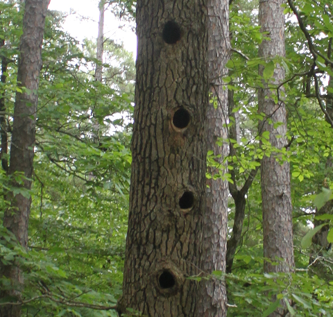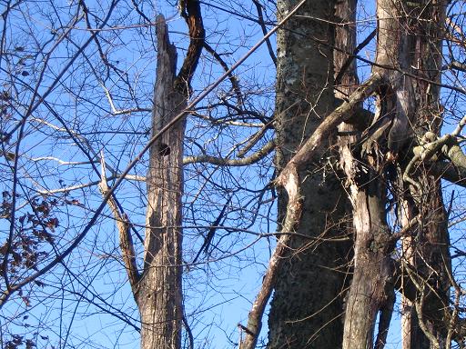 Woodpecker hole, Dec. 2005. Branches broken from 2000 ice storm.