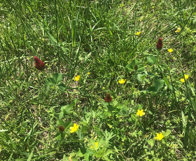 In the field there is buttercups and crimson clover. Crimson clover, Trifolium incarnatum, a herbaceous legume introduced from Eurasia, it can be invasive and weedy. Found statewide. Blooms May to August. A cultivated species. Found in fields. open areas, pastures, meadows, roadsides. The seeds and flowers are edible. Seeds can be sprouted and used in salads or sandwiches. They can also be dried and ground into flour. Flower heads can be used fresh or dried as a tea. Crimson clover is gaining popularity as a introduced winter-killed annual, like oats, in Zones 5 and colder. Montgomery County, Arkansas is zone 5.The buttercup, Ranunculus spp. has bright yellow flowers, can bloom any time of the year but mainly in spring and summer. Found in wet to dry areas in fields and woodlands, statewide in all types of soil. The seeds are often eaten by turkey. Buttercup not bitterwwed