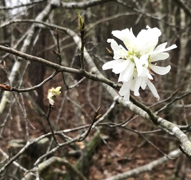 Otto Ernest Rayburn (1891-1960) spent virtually his entire adult life publishing magazines about the Ozarks region. He envisioned the Ozarks as an American Arcadia, with breathtaking scenery and a stalwart AngloSaxon culture, and published thousands of pages promoting its attractions. Gradually, however, it dawned upon him that the more people knew about his Arcadian paradise, the less like paradise it would be. Rayburn never made much money at publishing regional magazines. He persisted, however, for more than forty years and earned a place among the romantics, scholars, and promoters who, in the first half of the twentieth century, recorded the culture and lore of the southern mountains...Downy Serviceberry aka Sarvis, Service Berry, June Berry, Service tree, Shad bush, Wild plum, Sugarplum, Chuckley pear, Indian pear, Saskatoon, May cherry. A member of the rose family Amelanchier arborea. A small deciduous tree, usually much smaller than 50ft. Flowers are white petals, in drooping clusters appearing early before the leaves. Flowers are fragrant. The first large conspicuous white flowering tree to blossom in Arkansas forests. Fruitlike a tiny apple, sweet, edible, rounded, red to dark purple, ripens early June, eaten by birds and animals and probably by man since time of human habitation. Good fresh or in a pie. Smooth grey bark resembling that of the red maple. The leaves are are colourful in the fall - orange gold, red and green. A desirable ornamental tree, a good honey producer. Found throughout the state, fairly common on steep and stony hill slopes where it is associated with oaks and hickory. Reference: Trees of Arkansas by Dwight Moore, revised edition edited by Eric Sundell published by the Arkansas Forestry Commission, Little Rock. The 168 page book $5 from the Mt. Ida office just down the road from the ONF office, just east of Mt. Ida. Plant a root sucker in a pot, keep soil damp, second or third year it will take off.