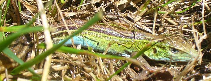 Prairie Lizard, gray, with a series of approximately 8 dark, jagged crossbars on the back, well camouflaged, found statewide.