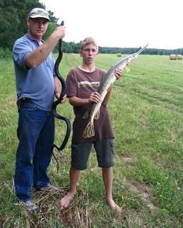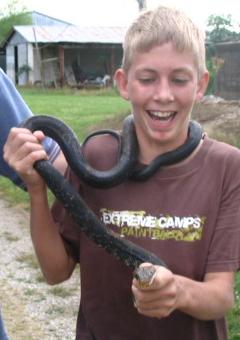 Redbud Acres, Brushy Road. May 2005. A 5 ft long harmless black king snake and an alligator gar.