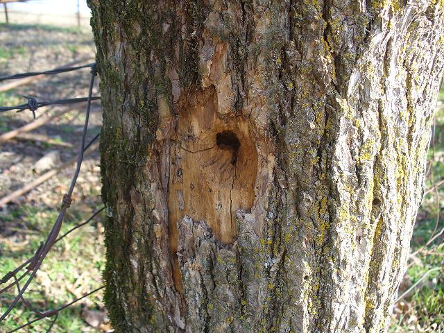 Is this a woodpecker hole? About three feet off the ground. Note tree is in a fence line.