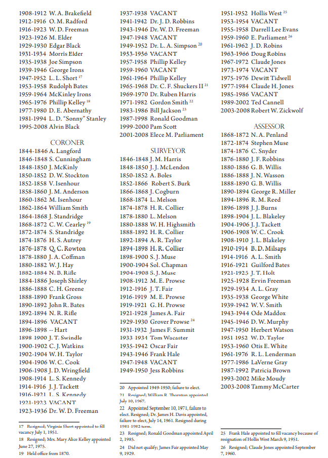 Coroners Langsford, A. 1844-46 Cunningham, S. 1846-48 McKinley, J. 1848-50 Stockton,D.W. 1850-52 Isenhour,V. 1852-58 Amerson, J.M. 1858-60 Isenhour, M.C. 1860-62 Smith, William 1862-64 Standridge, J. 1864-68 Cearly, C.W. 1868-72 Standridge, S. 1872-74 Autrey, H.S. 1874-76 Rowton, Q.C. 1876-78 Coffman, J.A. 1878-80 Hay, W.J. 1880-82 Rifle, N.B. 1882-84 Shirley, Joseph 1884-86 Greene, C.H. 1886-88 Gross, Frank 1888-90 |