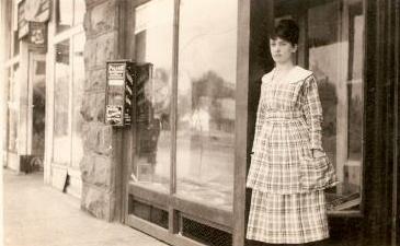 Willie Standridge in front of Drug Store on the Standridge block, George St., Mount Ida. She worked here. John met her here and they married on the side of the SQ. Post Office and Rx Dept. were back of the store between 1910 and 1920. She was granddaughter of Herman [?Harmon] Scott a Civil War veteran, he lived on what is now the Taft place.Willia Standridge, age 19, married John P. Holt 18 on Aug 7, 1919, Montgomery Co. Marriage book. They were still living in Mt. Ida in 1920.