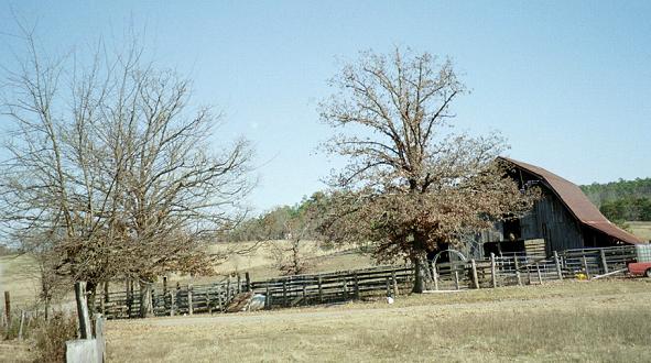 A detour to Oden. Just east one mile of Pine Ridge turn off Hwy 88 and south at the sign for the Little Hope Church, cross the Ouachita River, Pine Ridge Bridge, and look for Southside Road at the Y intersection and take it to the left. This road runs parallel to the river and comes out at Oden where you cross the Ouachita and met Hwy 88, again. Nov. 2006, it is tar sealed all the way. You will pass the Gortemiller Cemetery on your left and the Goodner Cemtery near a large barn on the right where the farmer's messy yard and farmhouse is directly across from the barn. The cemetery is behind the barn. I did not get a photo of that barn. This route can easily be taken in reverse. Off Hwy 88 at Oden turn south past the Oden Cemetery and across the Oden Bridge. Southside Road will be on your right at the first intersection.