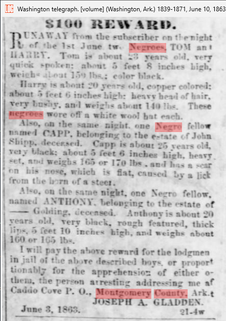 Slaves owners in Mountain Township, Hot Springs Co. in 1840 included Bledose, Cain, Covey Greenwood, Denton, Parker and Robertson. In 1840 in Caddo Cove Township Taylor Polk owned seven slaves and was head of a household of seventeen. In 1850 there was sixty-six slaves in Montgomery County, AR and only one free colored person, William Hodge, age 55, a trader b. in NC and living with the Blakely family in Mountain Township. By 1860 there were ninety-one slaves, no free colored persons and 3,541 whites. In 1870 there were 2,866 white persons in the county and 113 black. Some of these individuals above lived through the Civil War to become named citizens in Montgomery County, Arkansas and may have taken the name of the owner. The 1850s ledger of James A. Stall's merchant store in Mt Ida records the names of the following slaves buying small items for their owners or themselves e.g. tobacco or cloth for themselves.