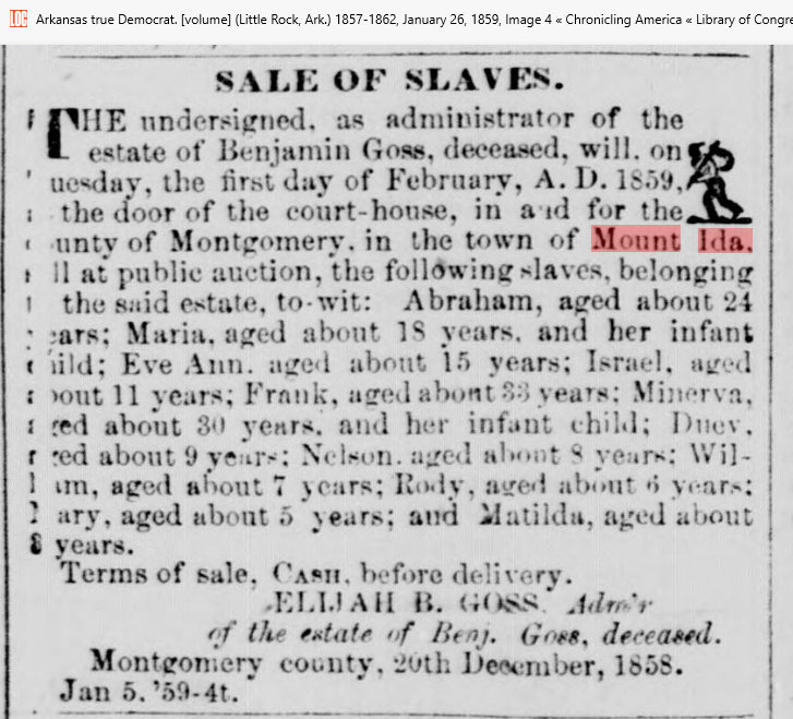 Goss died between 1853-56 in Montgomery County, Arkansas. Benjamin was a Captain
