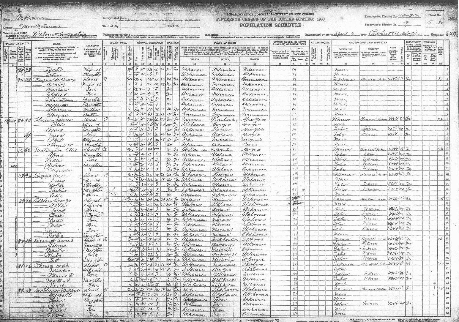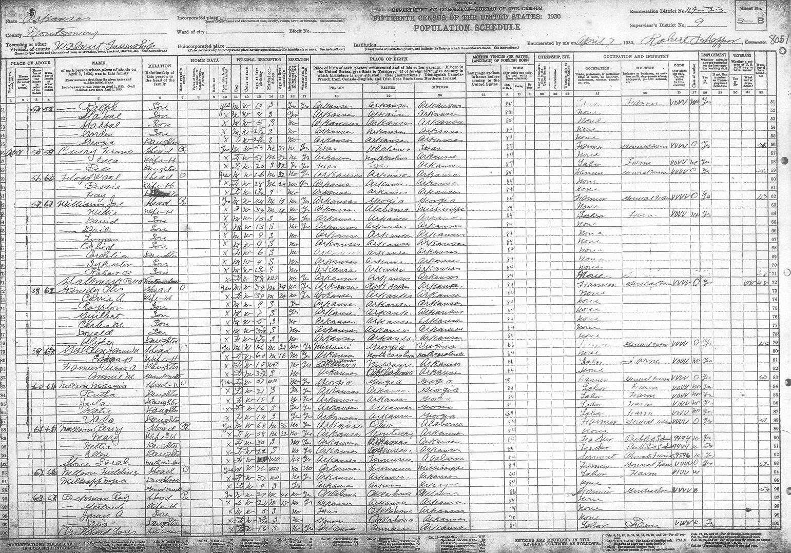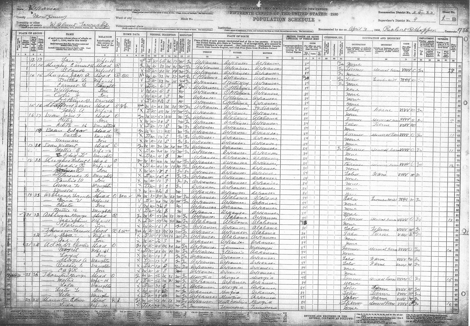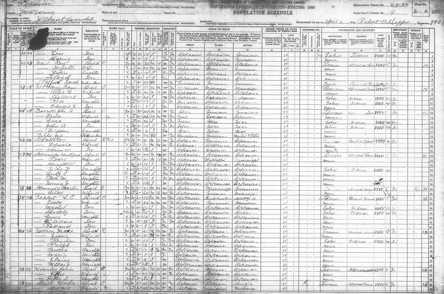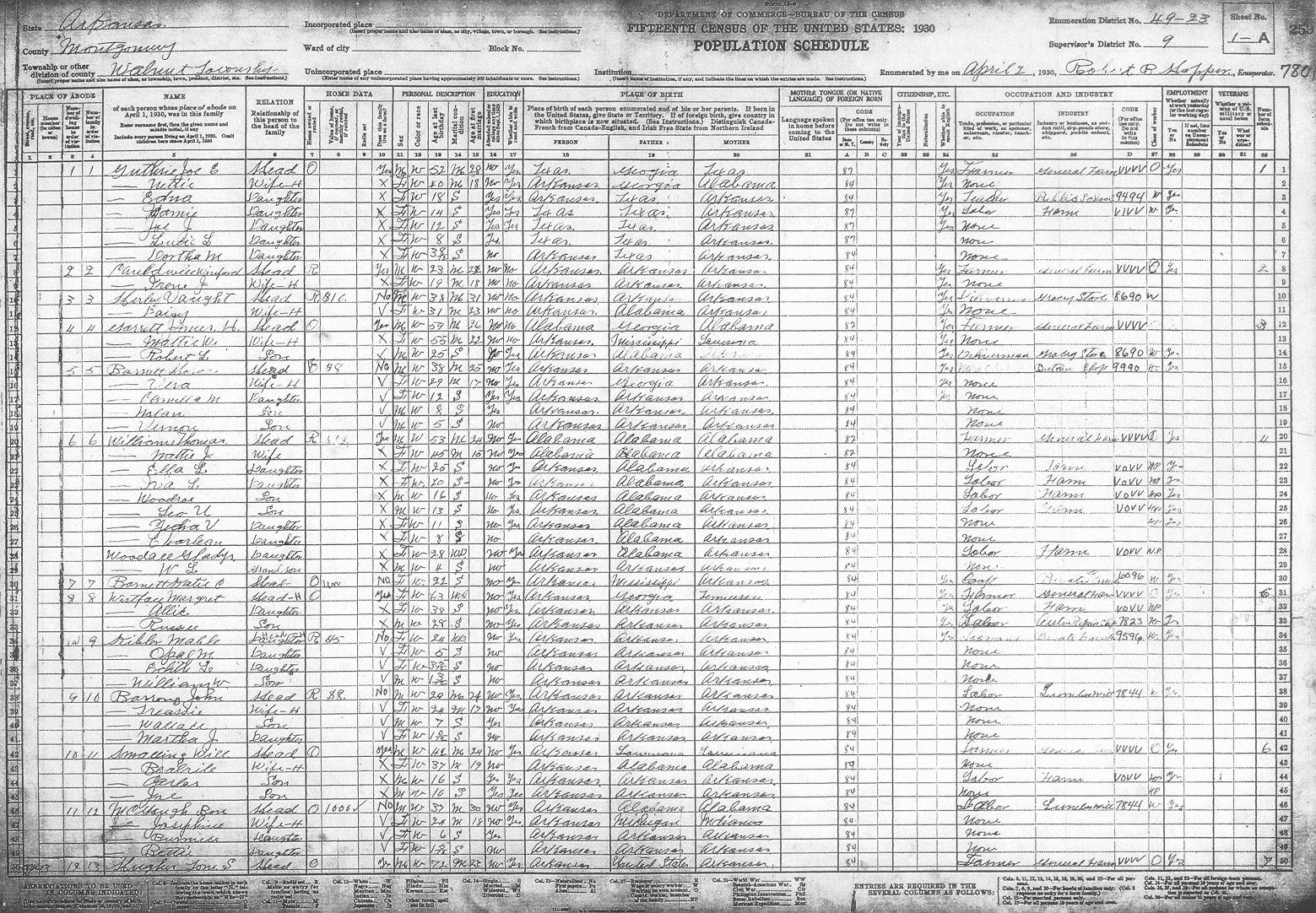 Arkansas, 1930, Montgomery County, Walnut Township, ED 49-23 Enumerator - Robert B. HopperLast Name First Name/MI Sheet # Family # Guthrie Joe E. 1-A 1 Guthrie Nettie 1-A 1 Guthrie Edna 1-A 1 Guthrie Jamie 1-A 1 Guthrie Joe J. 1-A 1 Guthrie Lulie ? L. 1-A 1 Guthrie Dortha M. 1-A 1 Cauldwell Winford 1-A 2 Cauldwell Irene 1-A 2 Hirley Vaught 1-A 3 Hirley Daisy 1-A 3 Garrett James H. 1-A 4 Garrett Mattie W. 1-A 4 Garrett Robert L. 1-A 4 Barnett Horace 1-A 5 Barnett Vera 1-A 5 Barnett Camilla M. 1-A 5 Barnett Nolan 1-A 5 Barnett Vernon 1-A 5 Williams Thomas 1-A 6 Williams Mattie J. 1-A 6 Williams Ella L. 1-A 6 Williams Iva L. 1-A 6 Williams Woodroe 1-A 6 Williams Leo U. 1-A 6 Williams Zedra ? V. 1-A 6 Williams Charlean 1-A 6 Woodall Gladys 1-A 6 Woodall W. L. 1-A 6 Barnett Katie C. 1-A 7 Westfall Margaret 1-A 8 Westfall Allic 1-A 8 Westfall Russell 1-A 8 Kibler Mable 1-A 9 Kibler Opal M. 1-A 9 Kibler Edith L. 1-A 9 Kibler William W. 1-A 9 Barrons John 1-A 10 Barrons Treassie 1-A 10 Barrons Wallace 1-A 10 Barrons Martha J. 1-A 10 Smalling Will 1-A 11 Smalling Bealrile ? 1-A 11 Smalling Carles 1-A 11 Smalling Joe 1-A 11 McGough Ben 1-A 12 McGough Josephine 1-A 12 McGough Burnice 1-A 12 McGough Bettie 1-A 12 Hughes Tom S. 1-A 13 Hughes Lou I. 1-B 13 Hughes Earnest H. 1-B 14 Hughes Blanche 1-B 14 Hughes Jack A. 1-B 15 Hughes Bertha L. 1-B 15 Hughes Earnest L. 1-B 15 Hughes William 1-B 15 Hughes Odis J. 1-B 15 Hughes Kathrine G. 1-B 15 Stafford Jason 1-B 16 Stafford Texie ? A. 1-B 16 Dean John L. 1-B 17 Dean Cletis 1-B 17 Dean Edith H. 1-B 17 Dean Edgar 1-B 18 Dean Dortha 1-B 18 Dean Norman 1-B 18 Dean Willart 1-B 19 Dean Mattie J. 1-B 19 Dean Edna L. 1-B 19 Hughes Robert E. 1-B 20 Hughes Gracie R. 1-B 20 Hughes James O. 1-B 20 Hughes Florence L. 1-B 20 Hughes Raubie D. 1-B 20 Hughes Anna H. 1-B 20 Hughes Donald 1-B 20 Ashbrook Landa 1-B 21 Ashbrook Neva V. 1-B 21 Ashbrook Chester 1-B 21 Ashbrook Bettie L. 1-B 21 Ashbrook George 1-B 22 Ashbrook Josiephine 1-B 22 Ashbrook Clarence 1-B 22 Thomason Larence 1-B 23 Thomason Esa 1-B 23 Thomason Joe E. 1-B 23 Adcock Charlie 1-B 24 Adcock Margrit 1-B 24 Adcock Loyd 1-B 24 Adcock Hazel A. 1-B 24 Adcock Bessie E. 1-B 24 Adcock C. A. Jr. 1-B 24 Thornton George 1-B 25 Thornton Mattie 1-B 25 Thornton Lola 1-B 25 Thornton Lester L. 1-B 25 Thornton Lela 1-B 25 Howerton Elmer 1-B 26 Howerton Lula 1-B 26 Howerton Lem 2-A 26 Howerton Harvy 2-A 26 Nash Roy 2-A 27 Nash Myrtle 2-A 27 Nash Lillin 2-A 27 Nash Floyd 2-A 27 Stafford Sarah 2-A 27 McLane Sam 2-A 28 McLane Attie L. 2-A 28 McLane Howard ? 2-A 28 McLane Rea 2-A 28 McLane Edward L. 2-A 28 Barrette John A. 2-A 29 Barrette Bula 2-A 29 Barrette Leona 2-A 29 Barrette John A. 2-A 29 Barrette Loraine 2-A 29 Tibbs Joe 2-A 29 L(??)atte Roy 2-A 30 L(??)atte Lynnia 2-A 30 L(??)atte James ? 2-A 30 Kennedy Guilford 2-A 31 Kennedy Pearl 2-A 31 Kennedy Gru??? W. 2-A 31 Kennedy Fay B. 2-A 31 Kennedy Lucy E. 2-A 31 Kennedy Ora M. 2-A 31 Kennedy Nomia J. 2-A 31 Kennedy Martin 2-A 32 Kennedy Lucy 2-A 32 Tackett L. C. 2-A 32 Tackett Della ? 2-A 32 Tackett Nershel ? 2-A 32 Tackett Shackley 2-A 32 Tackett Leona 2-A 32 Tackett Dillard 2-A 32 Tackett Rolland 2-A 32 Nellson Isac 2-A 33 Nellson Jessie 2-A 33 Nellson Reuben 2-A 33 Nellson Ralph 2-A 33 Nellson Bertha 2-A 33 Nellson Marie 2-A 33 Nellson Elaise 2-A 33 Nellson Nella J. 2-A 33 Mcauley ? Louis 2-A 34 Mcauley ? Effie 2-A 34 Mcauley ? Bettey ? 2-A 34 Smith Charlie 2-A 35 Smith Georgia 2-A 35 Prigget Vaunith ? 2-B 35 Givens ? ????? 2-B 35 Givens ? Lena 2-B 35 Smith Jeams 2-B 35 Robertson Pres 2-B 36 Robertson Josie M. 2-B 36 Robertson Jim 2-B 36 Robertson Mur 2-B 36 Robertson Pearl 2-B 36 Robertson Is??? M. 2-B 36 Edwards Mattie 2-B 37 Edwards Dentis R. 2-B 37 Edwards Vina M. 2-B 37 Driggers Willis ? 2-B 38 Driggers Sarah 2-B 38 Driggers Beney 2-B 39 Driggers Mares 2-B 39 Caldwell Erxer ? 2-B 40 Caldwell Myrtle 2-B 40 Caldwell Opxa ? 2-B 40 Caldwell Fenis 2-B 40 Caldwell Adell 2-B 40 Caldwell Mable 2-B 40 Caldwell Hester 2-B 40 Caldwell Haskle 2-B 40 Caldwell Lova ? J. 2-B 40 Diggs Dewey 2-B 41 Diggs Viola 2-B 41 Diggs Ruby 2-B 41 Smith Ed 2-B 42 Smith Lela 2-B 42 Smith Andy 2-B 42 Smith Edna 2-B 42 Smith Buster 2-B 42 Smith Anna B. 2-B 42 Cauldwell Dat 2-B 43 Cauldwell Clara 2-B 43 Cauldwell Raymond 2-B 43 Cauldwell Clifford 2-B 43 Cauldwell Opal 2-B 43 Echols Lemonds 2-B 44 Echols Margret 2-B 44 Echols Paul 2-B 44 Echols Murtty 2-B 44 Echols Flossie 2-B 44 Echols Florence 2-B 44 Brewster Walter 2-B 45 Brewster Elsie 2-B 45 Brewster Jewel 2-B 45 Brewster Vernon 2-B 45 Garrett Jessie 3-A 46 Garrett Georgia 3-A 46 Garrett Egar 3-A 46 Garrett Mary A. 3-A 46 Strews John H. 3-A 47 Strews Hellen 3-A 47 Strews Era 3-A 47 Strews Raymond 3-A 47 Strews Thad 3-A 47 Strews Lorann 3-A 47 Purtell George L. 3-A 48 Purtell Josephine 3-A 48 Nickelson ???ra M. 3-A 49 Nickelson Harret L. 3-A 49 Far??? Whit 3-A 50 Far??? Dessie P. 3-A 50 Far??? Jewell W. 3-A 50 Far??? Eluse ? 3-A 50 Far??? Za 3-A 50 Vaughn Orlise 3-A 51 Vaughn Oda 3-A 51 Vaughn Myrtle J. 3-A 51 Vaughn Clide 3-A 51 Vaughn Pauline 3-A 51 Vaughn Jack 3-A 51 Vaughn Jewell 3-A 52 Vaughn Lilley 3-A 52 Vaughn Hermond ? 3-A 52 Vaughn Hilrey 3-A 52 Vaughn Fern 3-A 52 Vaughn Cora 3-A 52 Vaughn Charlie 3-A 53 Vaughn Mattie E. 3-A 53 Vaughn Cyhris 3-A 53 Vaughn Roxey M. 3-A 53 Vaughn Lillian 3-A 53 Vaughn Rufus 3-A 54 Nichols Willie 3-A 54 Nichols Tomcie ? 3-A 54 Vaughn Verdie 3-A 55 Vaughn Emma L. 3-A 55 Vaughn Ester M. 3-A 55 Vaughn Mable 3-A 55 Vaughn Bernadine 3-A 55 Vaughn Leda H. 3-A 55 Montgomery Vestis 3-A 56 Montgomery Dell 3-A 56 Montgomery Pauline 3-A 56 Devedy ? Granvil 3-A 57 Devedy ? Inez 3-A 57 Devedy ? Ralph 3-B 58 Devedy ? Hachal 3-B 58 Devedy ? Hasbal 3-B 58 Devedy ? Gordon 3-B 58 Devedy ? Georgia 3-B 58 Cusry ? Frank 3-B 59 Cusry ? Ella 3-B 59 Cusry ? Bell 3-B 59 Floyd Wasel ? 3-B 60 Floyd Bell 3-B 60 Floyd Fay 3-B 60 Williams Joe 3-B 61 Williams Willie 3-B 61 Williams David 3-B 61 Williams Daile 3-B 61 Williams Luman ? 3-