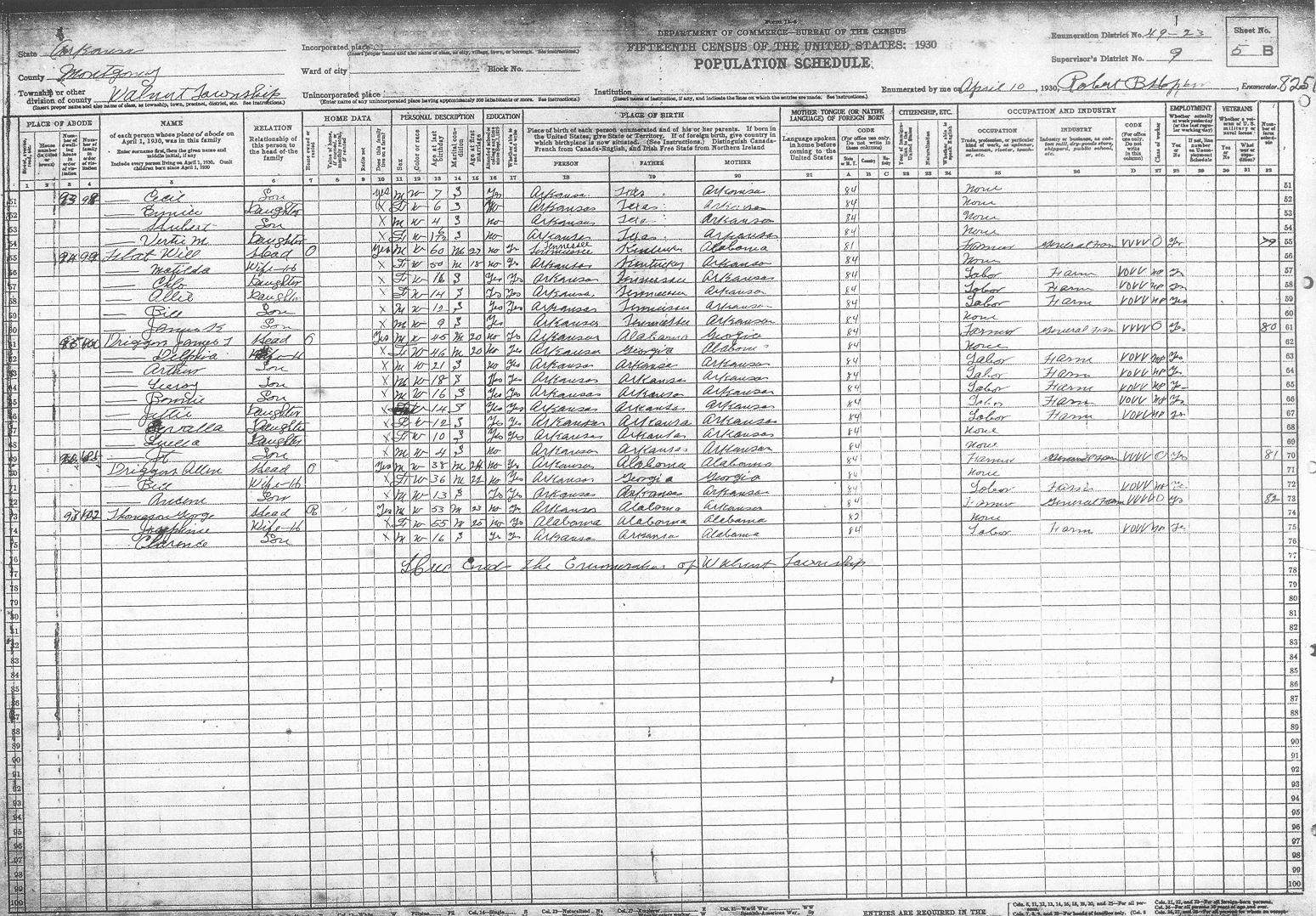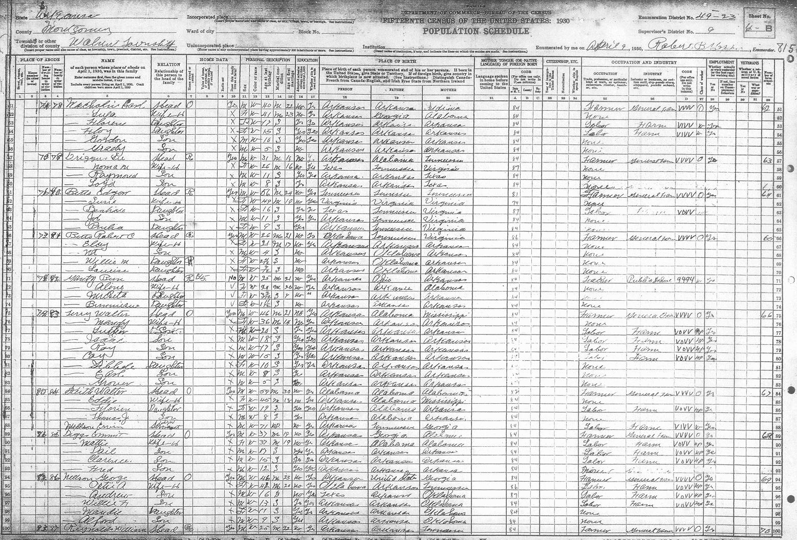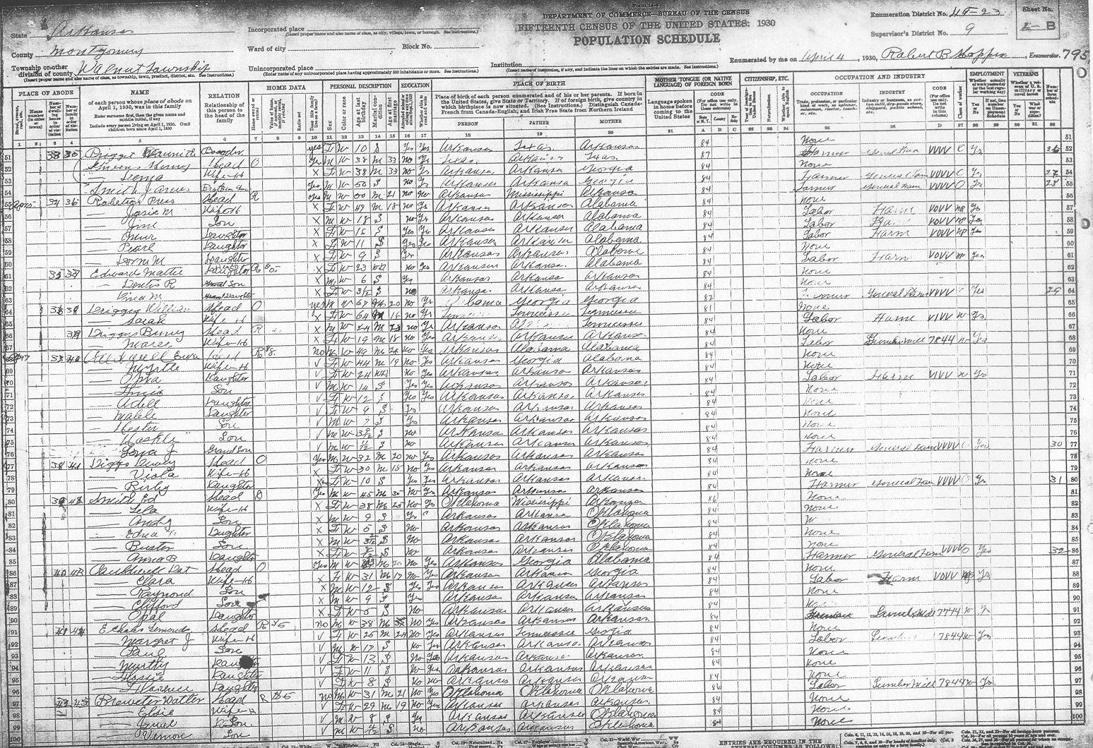 Arkansas, 1930, Montgomery County, Walnut Township, ED 49-23 Enumerator - Robert B. Hopper(no name listed) 3-B 66 Adcock Bessie E. 1-B 24 Adcock C. A. Jr. 1-B 24 Adcock Charlie 1-B 24 Adcock Hazel A. 1-B 24 Adcock Loyd 1-B 24 Adcock Margrit 1-B 24 Ashbrook Bettie L. 1-B 21 Ashbrook Chester 1-B 21 Ashbrook Clarence 1-B 22 Ashbrook George 1-B 22 Ashbrook Josiephine 1-B 22 Ashbrook Landa 1-B 21 Ashbrook Neva V. 1-B 21 Barnett Camilla M. 1-A 5 Barnett Horace 1-A 5 Barnett Katie C. 1-A 7 Barnett Nolan 1-A 5 Barnett Vera 1-A 5 Barnett Vernon 1-A 5 Barrette Bula 2-A 29 Barrette John A. 2-A 29 Barrette John A. 2-A 29 Barrette Leona 2-A 29 Barrette Loraine 2-A 29 Barrons John 1-A 10 Barrons Martha J. 1-A 10 Barrons Treassie ? 1-A 10 Barrons Wallace 1-A 10 Beckman Gertrude 3-B 67 Beckman Iris 3-B 67 Beckman James A. 3-B 67 Beckman Roy 3-B 67 Betts Beatrice ? 4-B 80 Betts Edgar 4-B 80 Betts Elcey 4-B 81 Betts Jc 4-B 80 Betts Louise 4-B 81 Betts Net 4-B 81 Betts Prulia 4-B 80 Betts Robert C. 4-B 81 Betts Susie 4-B 80 Betts Willie M. 4-B 81 Brewster Elsie 2-B 45 Brewster Jewel 2-B 45 Brewster Vernon 2-B 45 Brewster Walter 2-B 45 Caldwell Adell 2-B 40 Caldwell Bernice 5-B 98 Caldwell Boyd 5-A 97 Caldwell Cecil 5-B 98 Caldwell Erxer ? 2-B 40 Caldwell Fenis 2-B 40 Caldwell Haskle 2-B 40 Caldwell Hester 2-B 40 Caldwell Hubert 5-B 98 Caldwell Jula 5-A 97 Caldwell La?? 5-A 97 Caldwell Lova ? J. 2-B 40 Caldwell Mable 2-B 40 Caldwell Myrtle 2-B 40 Caldwell Myrtle 5-A 97 Caldwell Opxa ? 2-B 40 Caldwell Orval 5-A 97 Caldwell Vertie M. 5-B 98 Caldwell Willam 5-A 97 Carlen Allie 5-A 94 Carlen Bess 5-A 94 Carlen Charlie 5-A 94 Carlen Dortha 5-A 94 Carlen Fred 5-A 94 Carlen George 5-A 94 Carlen John 5-A 94 Carlen Oscar 5-A 94 Carson Carl 4-A 74 Carson Charlie H. 4-A 74 Carson Daisy L. 4-A 74 Carson Florence 4-A 74 Carson Irene 4-A 74 Carson Susie 4-A 74 Carson Will 4-A 74 Carson Willie M. 4-A 74 Cauldwell Clara 2-B 43 Cauldwell Clifford 2-B 43 Cauldwell Dat 2-B 43 Cauldwell Irene 1-A 2 Cauldwell Opal 2-B 43 Cauldwell Raymond 2-B 43 Cauldwell Winford 1-A 2 Cusry ? Bell 3-B 59 Cusry ? Ella 3-B 59 Cusry ? Frank 3-B 59 Dean Cletis 1-B 17 Dean Dortha 1-B 18 Dean Edgar 1-B 18 Dean Edith H. 1-B 17 Dean Edna L. 1-B 19 Dean John L. 1-B 17 Dean Mattie J. 1-B 19 Dean Norman 1-B 18 Dean Willart 1-B 19 Devedy ? Georgia 3-B 58 Devedy ? Gordon 3-B 58 Devedy ? Granvil 3-A 57 Devedy ? Hachal 3-B 58 Devedy ? Hasbal 3-B 58 Devedy ? Inez 3-A 57 Devedy ? Ralph 3-B 58 Diggs Angus 5-A 93 Diggs Cecil 5-A 93 Diggs Clarence 4-B 85 Diggs Dail 4-B 85 Diggs Dewey 2-B 41 Diggs Emmit 4-B 85 Diggs Evia 5-A 93 Diggs Fred 4-B 85 Diggs Mattie 4-B 85 Diggs Nola 5-A 93 Diggs Ruby 2-B 41 Diggs Thelma 5-A 93 Diggs Viola 2-B 41 Driggers Allen 5-B 101 Driggers Ancene ? 5-B 101 Driggers Arthur 5-B 100 Driggers Bell 5-B 101 Driggers Beney 2-B 39 Driggers Beralla ? 5-B 100 Driggers Bonnie 5-B 100 Driggers Delphia 5-B 100 Driggers James T. 5-B 100 Driggers Jettie 5-B 100 Driggers Jt 5-B 101 Driggers Lee 4-B 79 Driggers Leroy 5-B 100 Driggers Loyd 4-B 79 Driggers Luella 5-B 100 Driggers Mares 2-B 39 Driggers Norma M. 4-B 79 Driggers Raymond 4-B 79 Driggers Sarah 2-B 38 Driggers Willis ? 2-B 38 Echols Florence 2-B 44 Echols Flossie 2-B 44 Echols Lemonds 2-B 44 Echols Margret 2-B 44 Echols Murtty 2-B 44 Echols Paul 2-B 44 Edwards Dentis R. 2-B 37 Edwards Mattie 2-B 37 Edwards Vina M. 2-B 37 Far??? Dessie P. 3-A 50 Far??? Eluse ? 3-A 50 Far??? Jewell W. 3-A 50 Far??? Whit 3-A 50 Far??? Za 3-A 50 Farmer Annie 5-A 95 Farmer Annie M. 3-B 63 Farmer Ila 5-A 95 Farmer Maddie 5-A 95 Farmer Ruby 5-A 95 Farmer Verna 5-A 95 Farmer Verna A. 3-B 63 Featherston Alma 5-A 92 Featherston Ettie 5-A 92 Featherston Or???on 5-A 92 Featherston Willie 5-A 92 Featherston Zelma 5-A 92 Flat Bill 5-B 99 Flat Chlo 5-B 99 Flat James K. 5-B 99 Flat Matilda 5-B 99 Flat Ollie 5-B 99 Flat Will 5-B 99 Floyd Bell 3-B 60 Floyd Fay 3-B 60 Floyd Wasel ? 3-B 60 Gantz Aline 4-B 82 Gantz Benniesue ? 4-B 82 Gantz Bun 4-B 82 Gantz Micheta 4-B 82 Garrett Egar 3-A 46 Garrett Georgia 3-A 46 Garrett James H. 1-A 4 Garrett Jessie 3-A 46 Garrett Mary A. 3-A 46 Garrett Mattie W. 1-A 4 Garrett Robert L. 1-A 4 Givens ? ????? 2-B 35 Givens ? Lena 2-B 35 Golden Emma G. 3-B 63 Golden James M. 3-B 63 Guthrie Dortha M. 1-A 1 Guthrie Edna 1-A 1 Guthrie Jamie 1-A 1 Guthrie Joe E. 1-A 1 Guthrie Joe J. 1-A 1 Guthrie Lulie ? L. 1-A 1 Guthrie Nettie 1-A 1 Hallmark Pall A. 3-B 61 Hirley Daisy 1-A 3 Hirley Vaught 1-A 3 Howerton Elmer 1-B 26 Howerton Harvy 2-A 26 Howerton Lem 2-A 26 Howerton Lula 1-B 26 Hughes Anna H. 1-B 20 Hughes Bertha L. 1-B 15 Hughes Blanche 1-B 14 Hughes Donald 1-B 20 Hughes Earnest H. 1-B 14 Hughes Earnest L. 1-B 15 Hughes Florence L. 1-B 20 Hughes Gracie R. 1-B 20 Hughes Jack A. 1-B 15 Hughes James O. 1-B 20 Hughes Kathrine G. 1-B 15 Hughes Lou I. 1-B 13 Hughes Odis J. 1-B 15 Hughes Raubie D. 1-B 20 Hughes Robert E. 1-B 20 Hughes Tom S. 1-A 13 Hughes William 1-B 15 Keith Eddie 4-B 84 Keith Florien 4-B 84 Keith Thomas J. 4-B 84 Keith Walter 4-B 84 Kennedy Alice 3-B 62 Kennedy Carrie A. 3-B 62 Kennedy Chrles M. 3-B 62 Kennedy Donald 3-B 62 Kennedy Fay B. 2-A 31 Kennedy Gru??? W. 2-A 31 Kennedy Guilbert 3-B 62 Kennedy Guilford 2-A 31 Kennedy Lucy 2-A 32 Kennedy Lucy E. 2-A 31 Kennedy Martin 2-A 32 Kennedy Nomia J. 2-A 31 Kennedy Ora M. 2-A 31 Kennedy Otis 3-B 62 Kennedy Pearl 2-A 31 Kennedy Royston 3-B 62 Kibler Edith L. 1-A 9 Kibler Mable 1-A 9 Kibler Opal M. 1-A 9 Kibler William W. 1-A 9 L(??)atte James ? 2-A 30 L(??)atte Lynnia 2-A 30 L(??)atte Roy 2-A 30 Long Carrie L. 4-A 72 Long Charlie 4-A 73 Long Clarence 4-A 72 Long John T. 4-A 72 Long Lottie 4-A 73 Long Louie 4-A 72 Long Mery C. 4-A 72 Mcauley ? Bettey ? 2-A 34 Mcauley ? Effie 2-A 34 Mcauley ? Louis 2-A 34 McGough Ben 1-A 12 McGough Bettie 1-A 12 McGough Burnice 1-A 12 McGough Josephine 1-A 12 McLane Attie L. 2-A 28 McLane Edward L. 2-A 28 McLane Howard ? 2-A 28 McLane Rea 2-A 28 McLane Sam 2-A 28 Millsap Myra 3-B 66 Montgomery Dell 3-A 56 Mont
