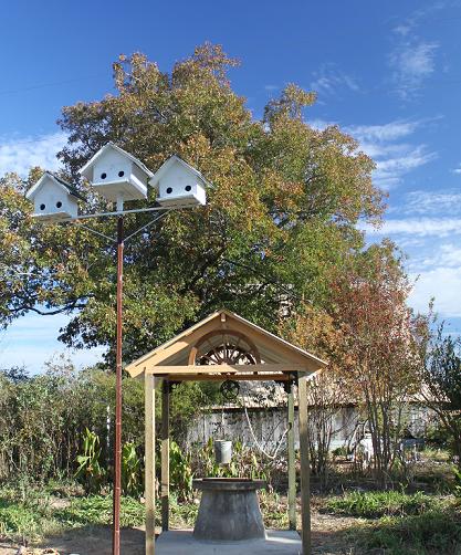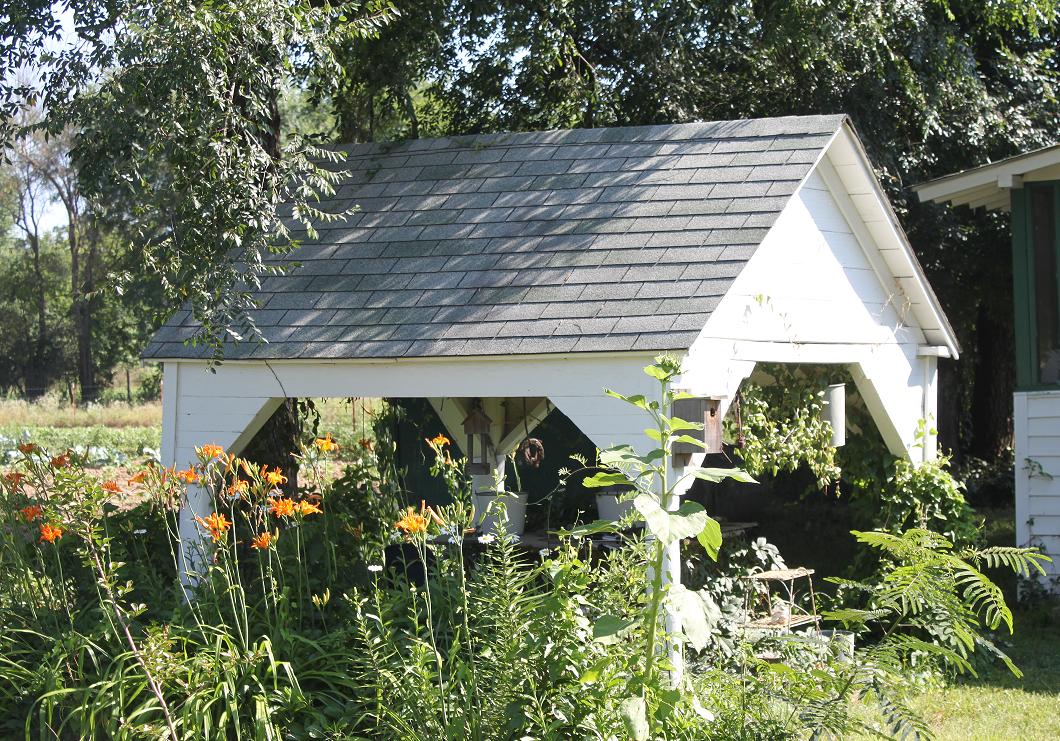 Same well house but different time of year. Nov. and in the summer of June 2010. Day lilies and a sunflower in the foreground with a birdhouse. A birdfeeder and horse shoes hanging with a couple of buckets. A large vegetable garden in the background.