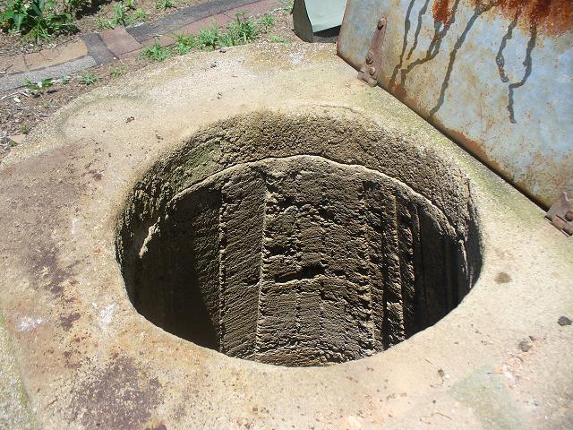 Dug wells are not very deep and were excavated below the groundwater table until incoming water exceeded the digger’s bailing rate. It was covered with a cap. The well is usually covered by a concrete curb that stands about a foot above the ground. The land surface around the well should be mounded so that surface water runs away from the well and is not allowed to pond around the outside.The top of the well above with the cover lifted. Wells down Brushy Rd.