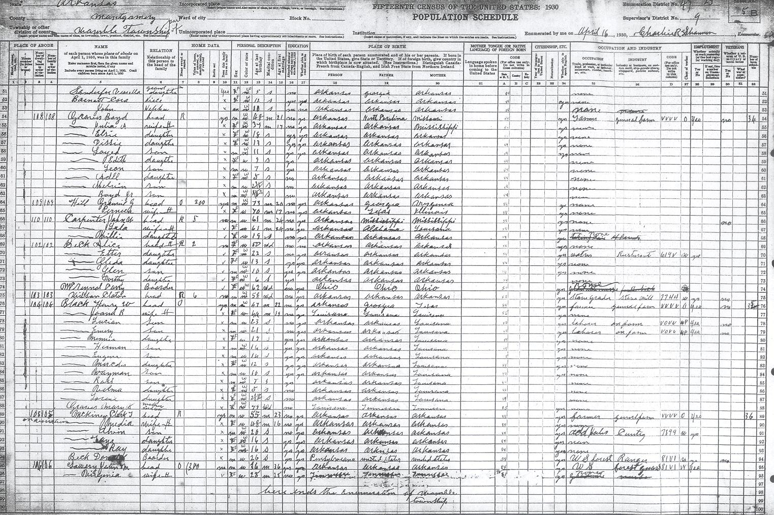 Arkansas, 1930, Montgomery County, Wolmbe Township, ED 49-25 Enumerator - Charlie R. ShannonLast First Household Pg Abernathy James A. 43-43 25 2-B Abernathy Sarah J. 43-43 25 2-B Alexnader Grant 51-51 25 3-A Alexnader Hattie 51-51 25 3-A Alexnader Faye 51-51 25 3-A Alexnader Lewis 51-51 25 3-A Anderson Alfred (Newton) 28-28 25 2-A Anderson Susan 28-28 25 2-A Anderson John 29-29 25 2-A Anderson Ella (Ruth) 29-29 25 2-A Anderson Arlie 29-29 25 2-A Anderson Clyde 29-29 25 2-A Anderson Ratha 29-29 25 2-A Anderson Lila 29-29 25 2-A Anderson Carl 29-29 25 2-A Baldwin Joseph M. 79-79 25 4-A Barnett Cora 107-107 25 5-B Bates Irvin 37-37 25 2-B Bates Gunzata (?) 37-37 25 2-B Bates Curtis 37-37 25 2-B Beck Alice 112-112 25 5-B Beck Etter 112-112 25 5-B Beck Gleda 112-112 25 5-B Beck Glen 112-112 25 5-B Beck Dorothy 112-112 25 5-B Beck Dorthy 115-115 25 5-B Black William L. 67-67 25 3-B Black Eula 67-67 25 3-B Black Marlin 67-67 25 3-B Black Mable 67-67 25 3-B Black Dortha 67-67 25 3-B Black Arnold 67-67 25 3-B Black Henry W. 114-114 25 5-B Black JoAnna B. 114-114 25 5-B Black Lucian 114-114 25 5-B Black Emory 114-114 25 5-B Black Minnie 114-114 25 5-B Black Mercedes 114-114 25 5-B Black Waymon 114-114 25 5-B Black Ross 114-114 25 5-B Black Velma 114-114 25 5-B Black Lorene 114-114 25 5-B Bogan Nora 21-21 25 1-B Bogan Claude 21-21 25 1-B Bogan Earl 21-21 25 1-B Burchell James A. 3-3 25 1-A Burchell Lillie (?) 3-3 25 1-A Bush Marion 33-33 25 2-A Bush Dovie 33-33 25 2-A Bush Jearld* 33-33 25 2-A Butterfield Margret 9-9 25 1-A Buzlee John L. 47-47 25 2-B Cagle Elmer 92-92 25 4-B Cagle Susie 92-92 25 4-B Cagle Jimmville (?) 92-92 25 4-B Calvin Gracie D. 39-39 25 2-B Calvin Elsie B. 39-39 25 2-B Carpenter John W. 110-110 25 5-B Carpenter Lola 110-110 25 5-B Caughran James H. 56-56 25 3-A Caughran Elsie 56-56 25 3-A Caughran Frank 56-56 25 3-A Caughran Carl 56-56 25 3-A Caughran Birl 56-56 25 3-A Caughran Iva 56-56 25 3-A Caughran Cecil 56-56 25 3-A Caughran Irein 56-56 25 3-A Caughran E. 87-87 25 4-B Caughran Ada 87-87 25 4-B Caughran Silis (?) 87-87 25 4-B Caughran Ulysses 87-87 25 4-B Claiburn Thelma 102-102 25 5-A Cogburn Ida 55-55 25 3-A Cogburn Glenn 55-55 25 3-A Cogburn Margaret 55-55 25 3-A Cogburn Ina 55-55 25 3-A Cogburn Evilen 55-55 25 3-A Cogburn Frank 55-55 25 3-A Colier William L. 19-19 25 1-B Colier Maud 19-19 25 1-B Cox Newman 68-68 25 3-B Cox Tennie (?) 68-68 25 3-B Cox Edward 68-68 25 3-B Cox Ray 68-68 25 3-B Cox Biggs W. 68-68 25 3-B Cox Othel Orvil 68-68 25 3-B Cox Juinat (?) 68-68 25 3-B Crump Myrtle 5-5 25 1-A Crump Cecil 5-5 25 1-A Crump Rhea 86-86 25 4-A Crump Macie 86-86 25 4-A Davis James H. 8-8 25 1-A Davis Dahila M. 8-8 25 1-A Davis Raymond 45-45 25 2-B Davis Emma 45-45 25 2-B Davis Berry H. 104-104 25 5-A Davis Lizzie 104-104 25 5-A Davis Daisy J. 104-104 25 5-A Davis Clara D. 104-104 25 5-A Dibble Lida 61-61 25 3-A Diggs Martin 42-42 25 2-B Doughten Robert W. 95-95 25 4-B Doughten Rosie E. 95-95 25 4-B Doughten RoseBud 95-95 25 4-B Doughten Janie C. 95-95 25 4-B Doughten Robert P. 95-95 25 4-B Doughten Charles W. 95-95 25 4-B Doughten James J. 95-95 25 4-B Doughten Lena J. 95-95 25 4-B Doughten May J. 95-95 25 4-B Doughten Fannie M. 95-95 25 4-B Ellis James K. 61-61 25 3-A Ellis Lidie 61-61 25 3-A Ferguson Willie 12-12 25 1-A Ferguson Charles J. 47-47 25 2-B Ferguson Margie 47-47 25 2-B Ferguson Olin 47-47 25 2-B Gantz Earl 46-46 25 2-B Gantz Dora 46-46 25 2-B Gantz Claud 46-46 25 2-B Granit (?) Larry (?) 99-99 25 5-A Granit (?) Faney 99-99 25 5-A Graves Thomas 76-76 25 4-A Graves Elizabeth (?) 76-76 25 4-A Graves Elsie 76-76 25 4-A Graves Rufus 76-76 25 4-A Graves Edna 76-76 25 4-A Graves Edman 76-76 25 4-A Graves Bahan (?) 76-76 25 4-A Graves Boyd 108-108 25 5-B Graves Julia A. 108-108 25 5-B Graves Elise 108-108 25 5-B Graves Dissie 108-108 25 5-B Graves Loyd 108-108 25 5-B Graves Edith 108-108 25 5-B Graves Leon 108-108 25 5-B Graves Adell 108-108 25 5-B Graves Melvin 108-108 25 5-B Graves Boyd Jr. 108-108 25 5-B Graves Mary J. 114-114 25 5-B Hale James P. 105-105 25 5-A Hale Mary A. 105-105 25 5-A Hall James P. 102-102 25 5-A Hall Jessie 102-102 25 5-A Hall Preston 102-102 25 5-A Hamilton Ray 58-58 25 3-A Hamilton Effie 58-58 25 3-A Hamilton Henry 97-97 25 5-A Hamilton Rosie E. 97-97 25 5-A Hamilton Ree W. (?) 97-97 25 5-A Hamilton Ester Mae 97-97 25 5-A Hamilton Hazel Fay 97-97 25 5-A Harp William 15-15 25 1-A Harp Cleo 15-15 25 1-B Harp Jackie (?) 15-15 25 1-B Harp John 15-15 25 1-B Harp Joseph 26-26 25 2-A Harp Mary 26-26 25 2-A Harp Arlie 26-26 25 2-A Hawker Christine 23-23 25 1-B Hawker Harmon 23-23 25 1-B Hawker Mary A. 23-23 25 1-B Henderson Edna M. 8-8 25 1-A Henderson Sarah L. 8-8 25 1-A Hendrix Dan 84-84 25 4-A Hendrix Chrastina (?) 84-84 25 4-A Hendrix Ralla 91-91 25 4-B Hendrix Mary 91-91 25 4-B Hendrix Emmitt 91-91 25 4-B Hendrix Virgie 91-91 25 4-B Hendrix Orval 91-91 25 4-B Hendrix Bessie 91-91 25 4-B Hendrix Eva 91-91 25 4-B Hendrix Vernice 91-91 25 4-B Hickman Minie 41-41 25 2-B Hickman Kale 41-41 25 2-B Hickman Jane 41-41 25 2-B Hill Thomas D. 27-27 25 2-A Hill Emma 27-27 25 2-A Hill Clarence 73-73 25 3-B Hill Oma 73-73 25 3-B Hill Henry 75-75 25 4-A Hill Saery (?) 75-75 25 4-A Hill Winfred 75-75 25 4-A Hill Clyde (?) 98-98 25 5-A Hill Mollie 98-98 25 5-A Hill Lodie 98-98 25 5-A Hill Ray/Roy 98-98 25 5-A Hill Otto 98-98 25 5-A Hill William L. 107-107 25 5-A Hill Gremil (?) 109-109 25 5-B Hill Perneca (?) 109-109 25 5-B Horne Cleve L. 78-78 25 4-A Horne Emma 78-78 25 4-A Horne Samuel M. 78-78 25 4-A Horne Esther M. 78-78 25 4-A Horne Ruth 78-78 25 4-A Horne Harvey 78-78 25 4-A Horne Betty 78-78 25 4-A Howard Rufus 66-66 25 3-B Howard Rose 66-66 25 3-B Howard Jewel 66-66 25 3-B Howard Mary E. 66-66 25 3-B Howard Martin 66-66 25 3-B Howard Perry 66-66 25 3-B Howard Allen 66-66 25 3-B Howard Vernel 66-66 25 3-B Howard Junior 66-66 25 3-B Howell Jack 34-34 25 2-A Howell Stuart 34-34 25 2-A Howell Oskar 34-34 25 2-A Howell Earnest T.* 34-34 25 2-A Howerton 