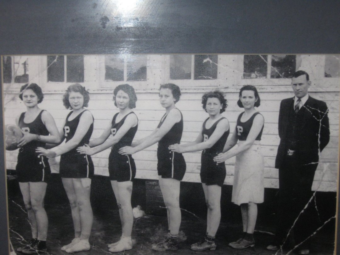 Edith Brown Wilson (my mom) holding the ball, Pauline Graham, Alene Graham, Lavena Crowder, Francis Bruce, Ruth White and Coach J. W. Deaton.