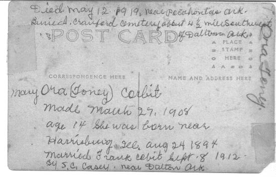 She married Frank Corbit on September 8, 1912 near Dalton Ark.
