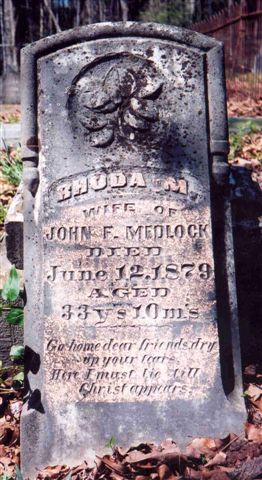 Rhoda M. Died, June 12, 1879, Age 33 years, 10 months wife of John F. Medlock