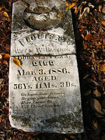 Louisa, wife of William, Tombstone Image born in Tennessee Died March 3, 1886, age 56-11-3