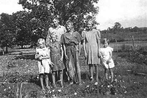 Pictured above and below are John D. Alley and his wife Virgie (Nelson) Alley. John D. was born 14 May 1895, the youngest son of Martin VanBuren Alley and Sarah Angeline Maynard. Virgie was born c1903, a daughter of Samuel S. Nelson and Cora Shadd. John D. Alley and Virgie B. Nelson were married 27 November 1919 in Scott County. At the bottom of this page is a photo of the children of John D. Alley and Virgie Nelson. Undated photo labeled "Uncle John Alley's Kids." His children's names are: Anna Veda (b. 1921), Chester Noel (b. 1924), Ada Mae (b. 1926), John Clark (b. 1928), Audie Bell (b. 1930), Alice Jane (b. 1933), Alta Elnora (b. 1935), and Betty Angeline (b. 1940). Don't know what order these kids are in; some may not have been born yet. My guess is that Anna Veda and Betty Angeline are not pictured.