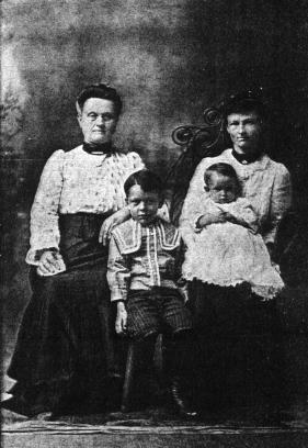 The boy is Otis Johnson; I believe the woman holding the baby is his mother Hattie Angiline Butler Johnson, who married Thomas "Bud" Johnson. The other woman is my second great grandmother Priscilla Emmarine Hutchinson Johnson, who married Thomas H. Johnson, my second great grandfather. I am guessing the baby is Hattie's second child Lois Leona Johnson Langley, who married Luther Langley. If anyone can positively identify the people in this picture, please contact Barbara Hale Reynolds.