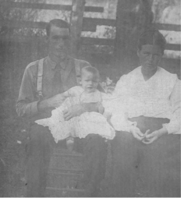 Benjamin Allen Morrow (20 June 1888 - 3 April 1974) and Ollie Clementine Harris Morrow (25 May 1891 - 16 February 1961) holding their oldest son, Charles "Charley" Matthew Morrow (4 April 1912 - 9 October 1999.) They had two daughters, Geneva (14 October 1908 - 24 November 1910) and Jossie (25 March 1910 - 12 June 1911) who both passed away before Charley was born. There were four other children born after Charley. For more complete details of this family click here. Date of the above picture is unknown, but probably late 1912 or early 1913.