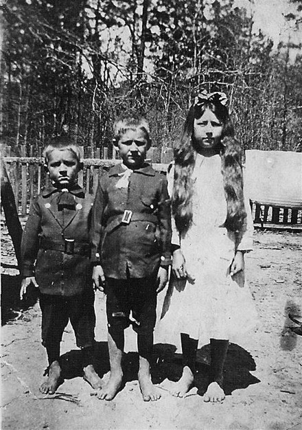 Undated photo labeled "On our homeplace." Pictured are Robert Emmit, Taulby Monroe, and Mary Alifaire Locke in Arkansas, probably in Chant or Johnson Creek. They were children of Samuel Benjamin Locke and Stella Elizabeth Alley.