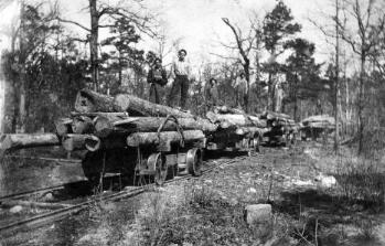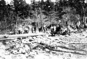 On the back of this photo is written: "This is where the boys unloads their logs about 3 miles from the mill Burt Hant an Hear Will and Charley and Papa's. The O is Charlie the X is Will the H is Papa that's Lib Pittes between the grae Mules Frank sits by Charley." The photo below is of the Shrader boys coming to the mill. If you can identify any of them, please contact Belinda Upton.