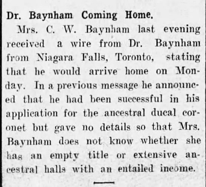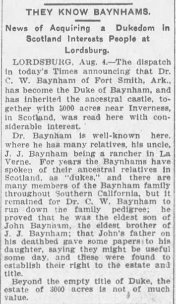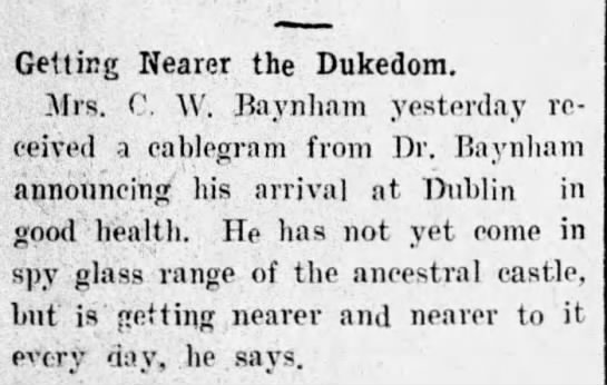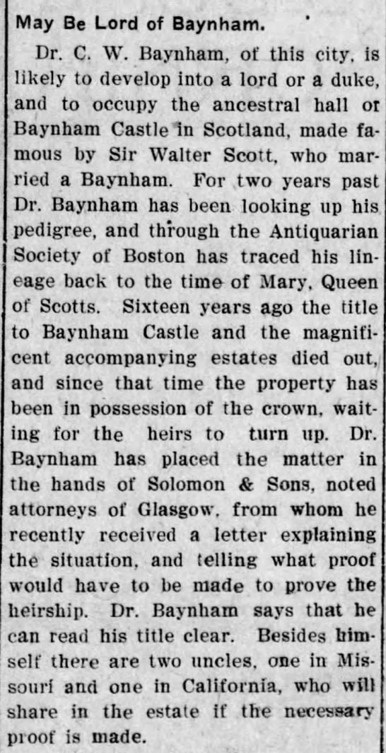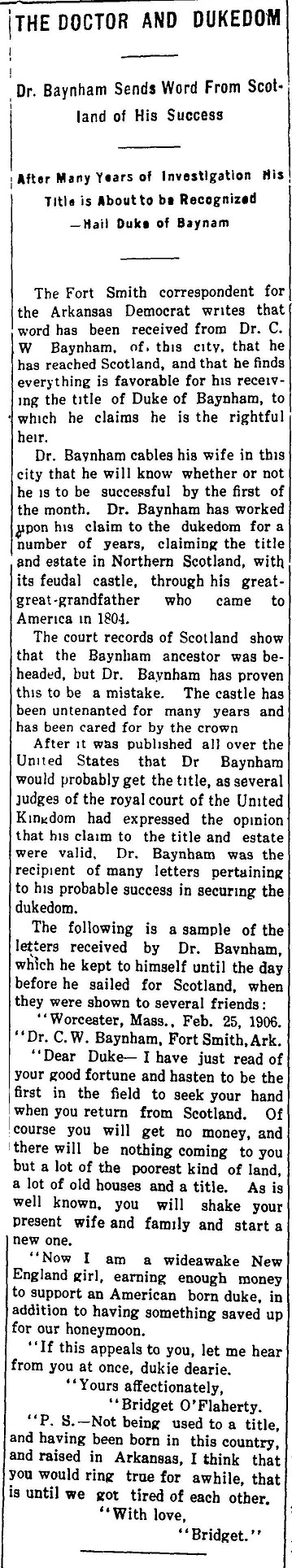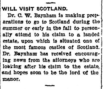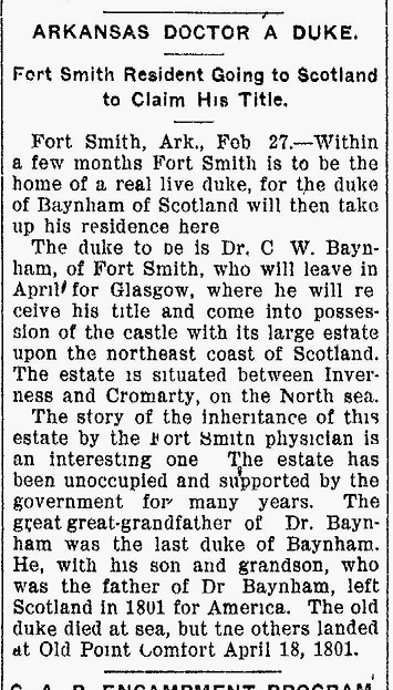 her brother, Dr. C. W. Baynham of Fort Smith, Ark., has proved his claim as heir to a dukedom in Scotland, and has been