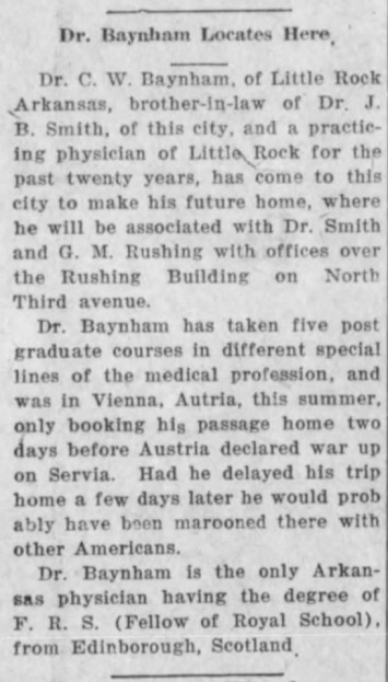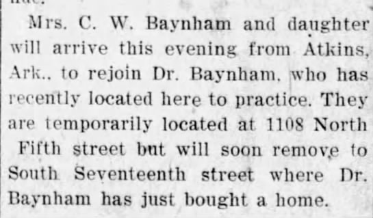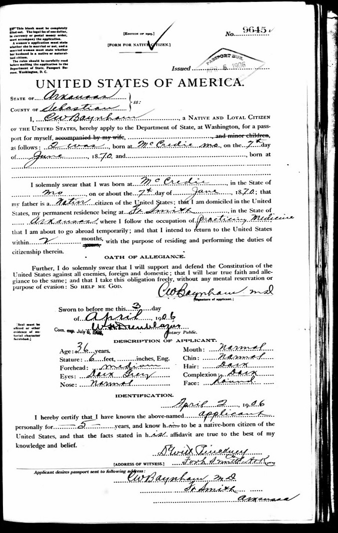 However, Dr. Baynham applied for a passport on 3 April 1906 and may have traveled to Scotland. A few months later on