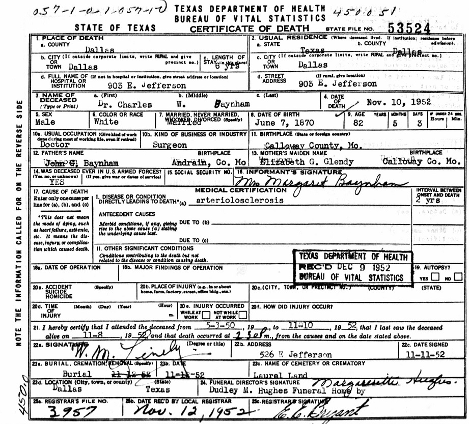 Almost nothing about story is credible. Even a brief search of genealogical records would show that Dr. Baynham was not