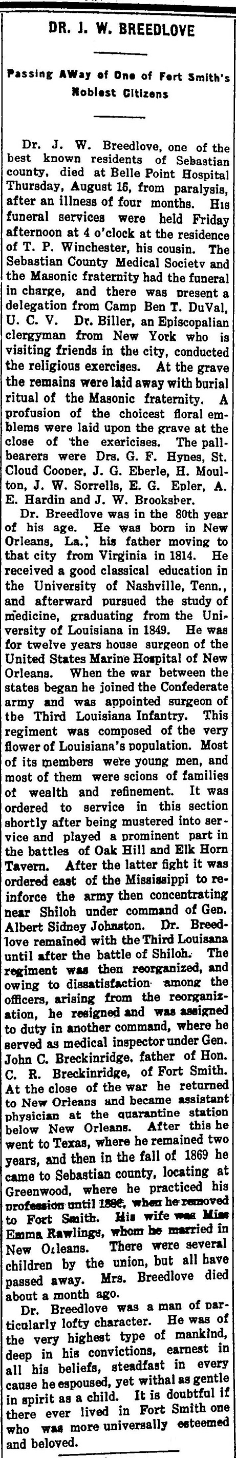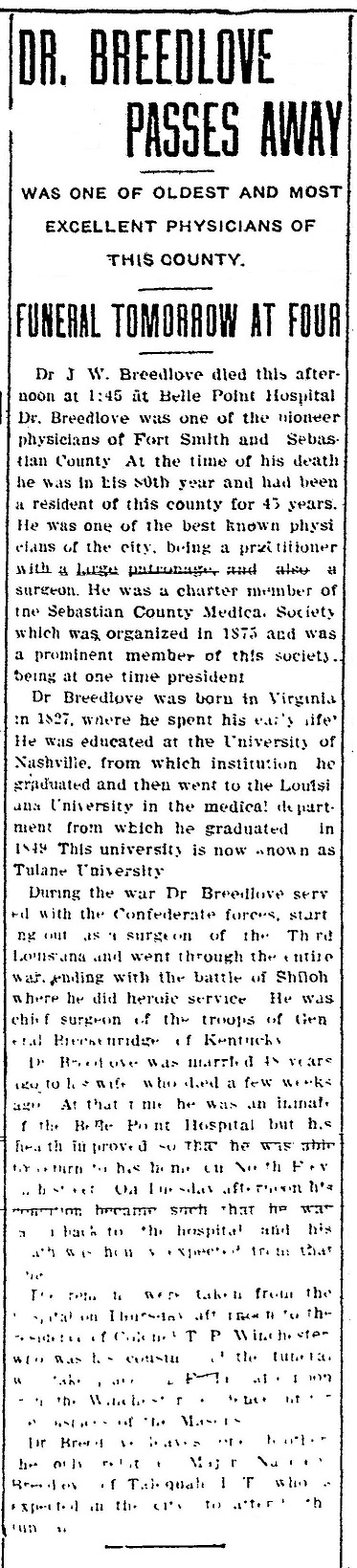 According to "Goodspeed's Histories of Arkansas," Breedlove was house surgeon of the U.S. Marine Hospital of New Orleans for 12 years before