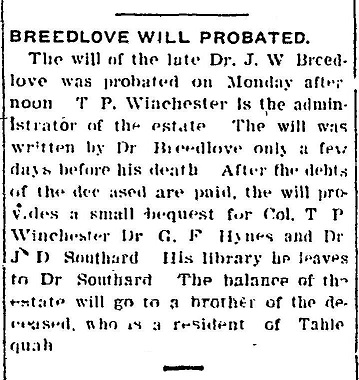 The News Record also reported when Dr. Breedlove's will was probated, on Aug. 28, 1906, noting that he left his library to Dr. Southard