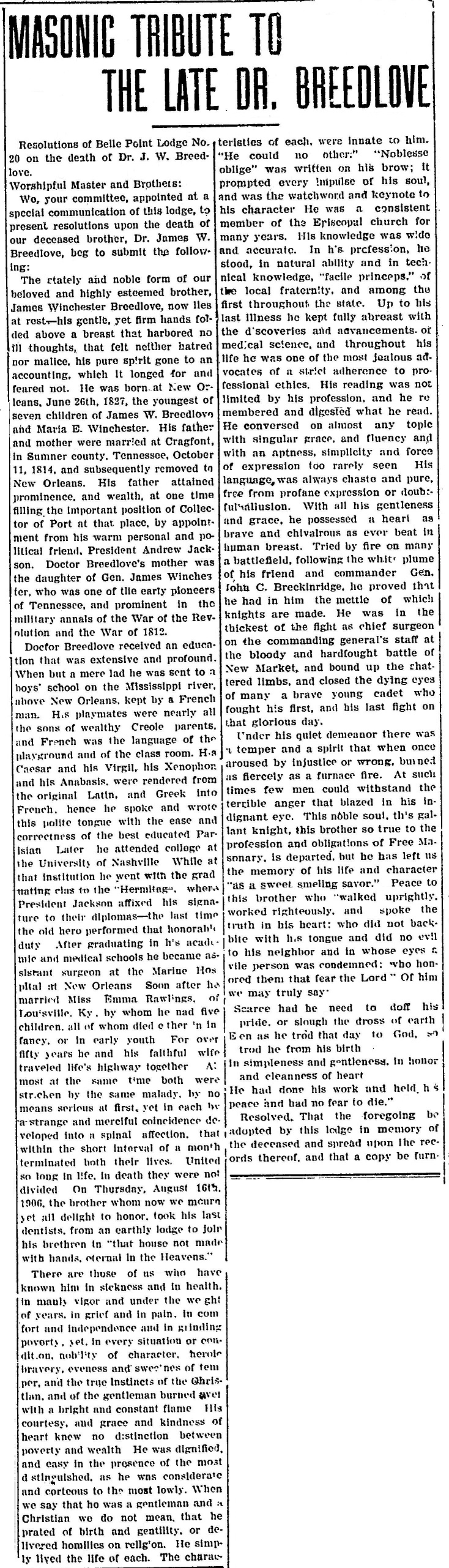 Dr. James Winchester Breedlove was born in New Orleans in 1827, educated at the University of Nashville and Louisville University (now