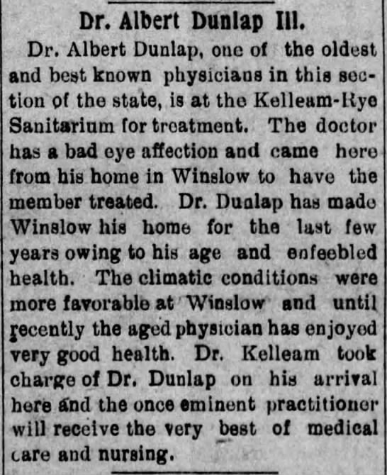 06/01/1880 - Practiced medicine, Ft. Smith, Sebastian Co., AR (lived with wife and two children - indexed in the 1880 U.S. Census as Albert Dunlap)