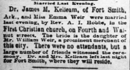 Dr. Jason M. Kelleam died March 22, 1906, in Fort Smith, Arkansas, at the age of 46 years, 4 months,