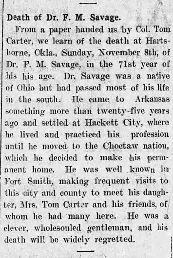 Dr. Francis Marion Savage was born in Illinois on June 1, 1832 and died at Hartshorne,