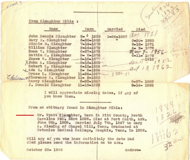 Dr Wyatt Slaughter was born Febtruary 23, 1826 in Pitt Co., North Carolina to