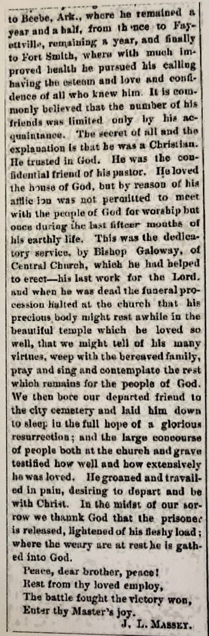 He passed away June 9, 1888 at Fort Smith, Sebastian Co.,