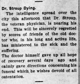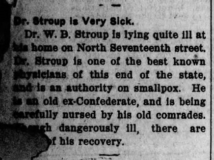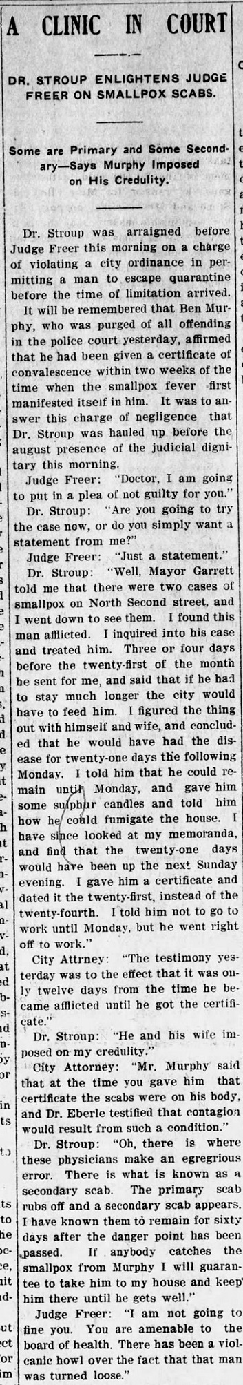 02/27/1902 - Dr. Stroup was considered to be an expert on the diagnosis and treatment of smallpox, but he was arraigned before a judge