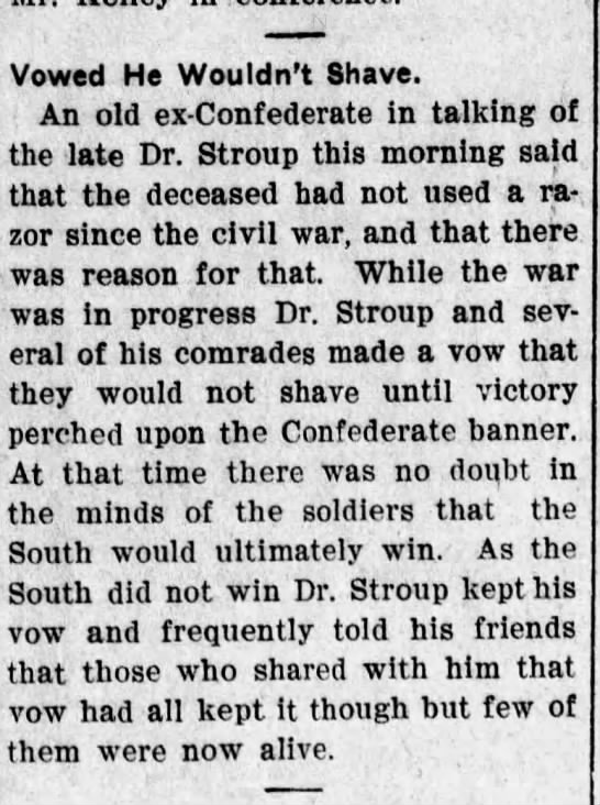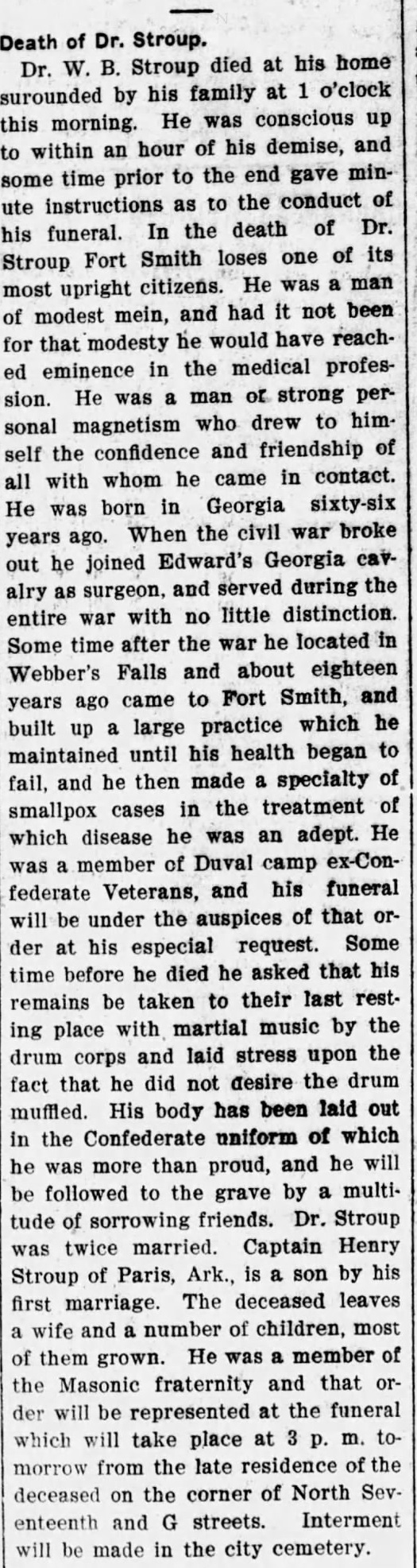 Dr Walter Bedford Stroup b. Oct 1835 in Georgia, d. 26 Aug 1902 Fort Smith, Sebastian County, Arkansas and is buried at Oak Cemetery.