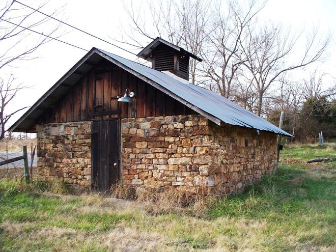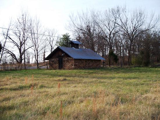 This historic old building is located just north of Bear Hollow Road on Hwy 45 south of Bonanza, Ar. The old potato house was restored by Art Martin, who also was part of the Fort Smith Trolley restoration. The reconstruction included such work as replacement of the tin roof and putting the rocks back in place on the walls. It was originally built by W.A. Douglass.