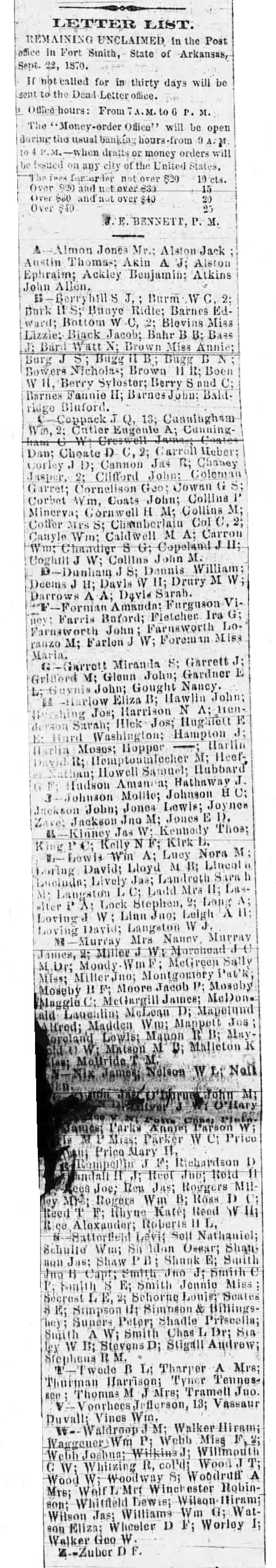REMAINING UNCLAIMED in the Post office in Fort Smith, State of Arkansas, Sept 22, 1870.
