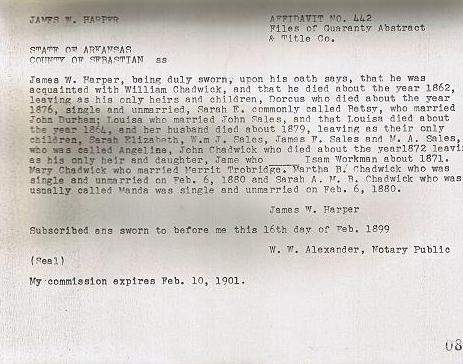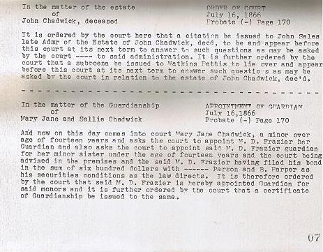 22 Names Mentioned on the Following 4 Pages: Wm Chadwick,  John Chadwick,  John Sales,  Watkins Pettis,  Mary Jane  & Sallie Chadwick,  M.D. Frazier,  Parson,  B. Harper,  James W. Harper,  Dorcus,  Sarah E. Betsy  & Louisa Chadwick,  John Durham,  Wm J. Sales,  James F. Sales  & M.A. Angeline Sales,  Isam Workman,  Merrit Trobridge,  Martha B. Chadwick,  Sarah A.M.B. Manda Chadwick  & W.W. Alexander.