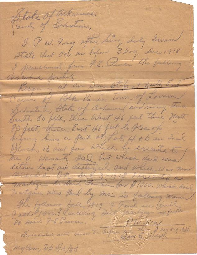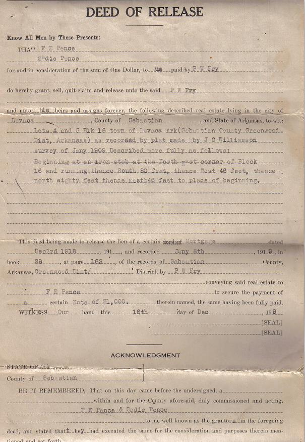 Deed from F.E. & Sadie Pence to P.W. Fry - 1918