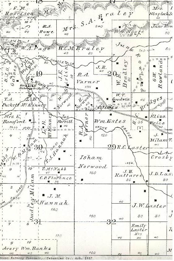 Surnames on plat map below: Rowe, Braley, Blaylock, Page, Wright, Harrison, Moore, Rowland, Bradley, Varner, Stirling, McKinney, Norwood, Hansford, Merritt, Milam, McNabb, Florence, Rattaree, Norwood, Laster, Price, Crosby, Banks, Bridges.