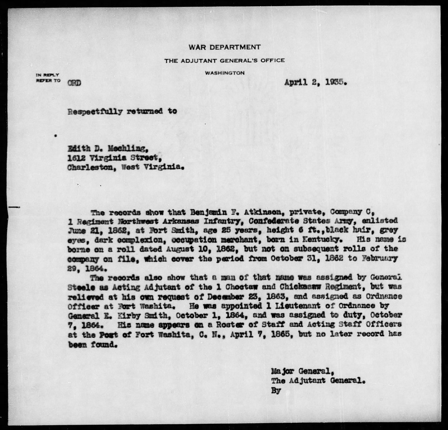 During the Civil War, Ben Atkinson joined the Confederate army, receiving an appointment to the rank of captain.