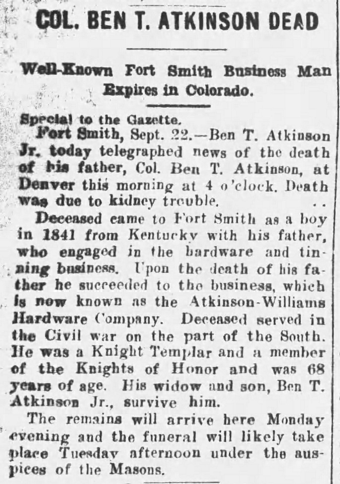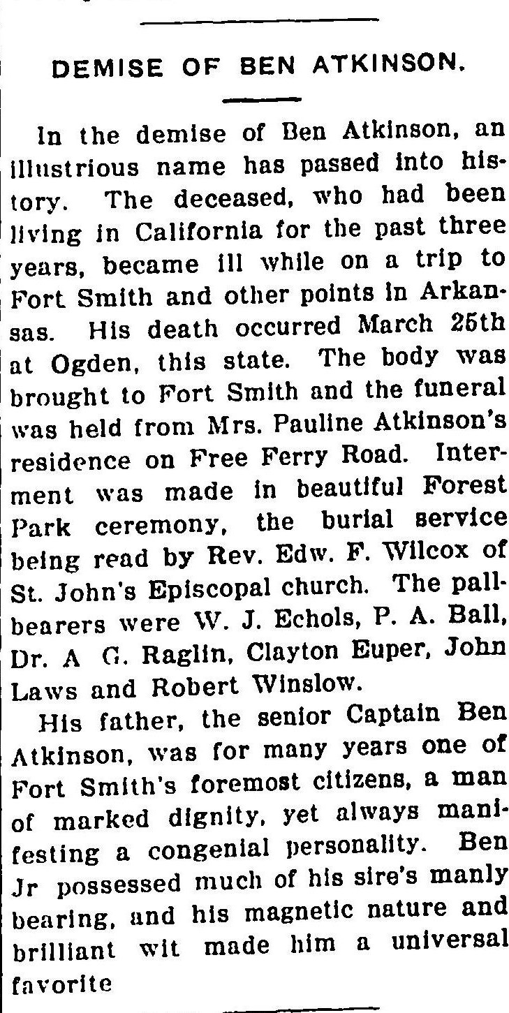 The Daily News Record mourned the loss "one of the most polished gentleman of Fort Smith" at his death on Sept. 23, 1905.