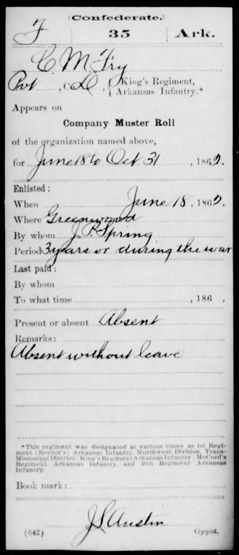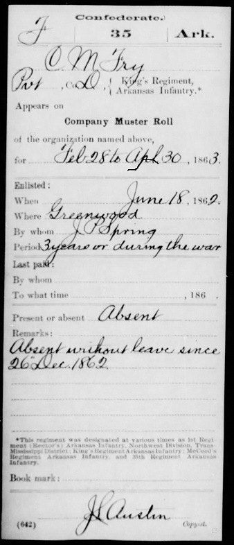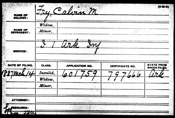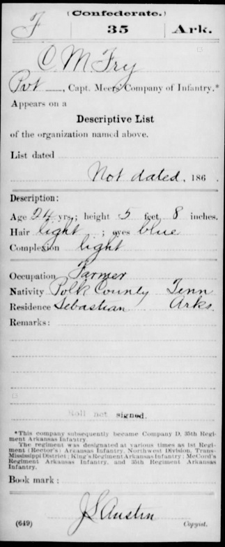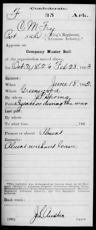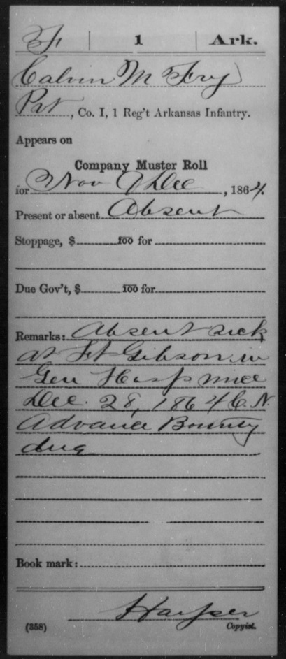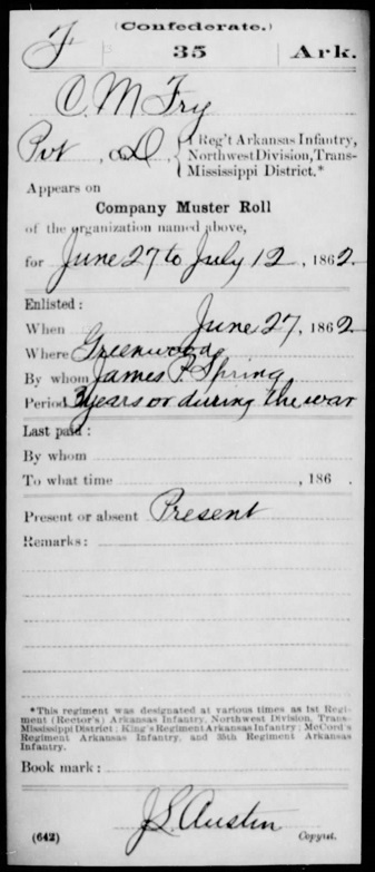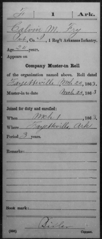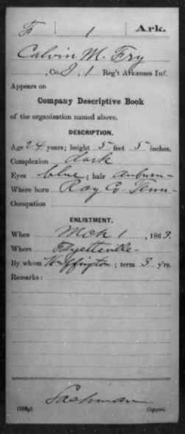 Newel Clarence & Lucinda Fry. He enlisted in the 1st ARKANSAS INFANTRY